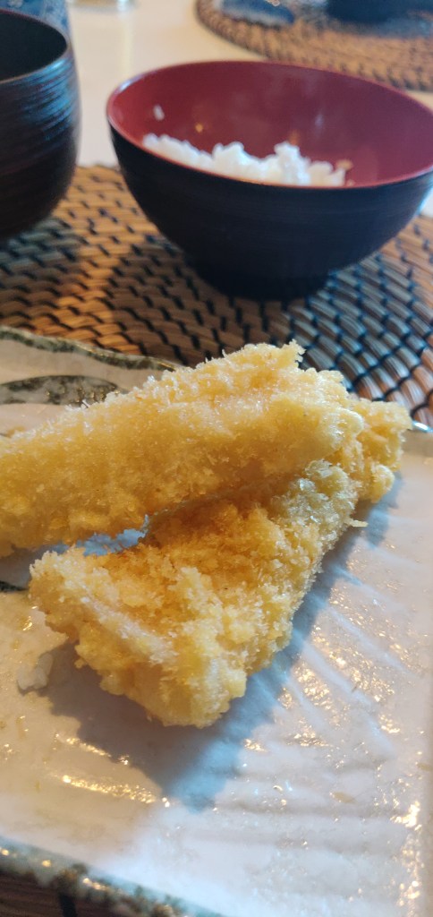Tempura is a Japanese dish of fried veggies and fish or prawns. I used pike for this, but most thin, boneless white fish work well. A thinner fish is preferred, because the batter and panko coating is not that thick. When frying, you can use both the batter and panko, or just the batter. Using the panko gives you a crispier end result, but it can be a bit messier. I used panko only for the fish. When frying, it’s important that the oil is hot enough. I don’t have a thermometer, so I use a piece of bread to check it. After frying transfer the tempura onto a wire rack to drain for a minute before eating. I recommend serving tempura with rice and miso soup.
