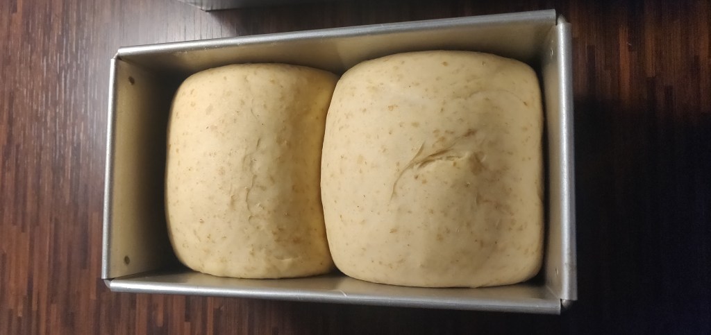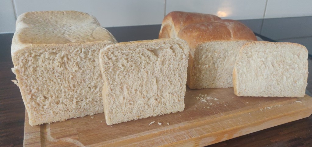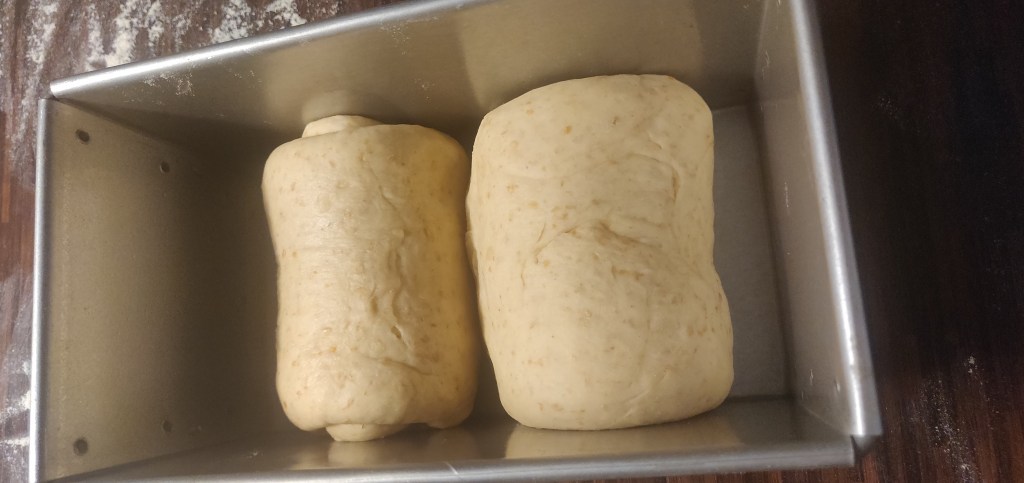 This recipe uses the yudane method for the dough. It’s really simple, but it does take quite a bit of time, as the yudane has to rest for a couple hours.. The dough is rolled and shaped before adding to the tin. This ensures that there aren’t any large air pockets and helps it rise evenly while baking. For the loaf, I’d recommend baking it in a tin with a lid. I made two loaves, one with a lid and one without, and I like the shape of the square bread more.
