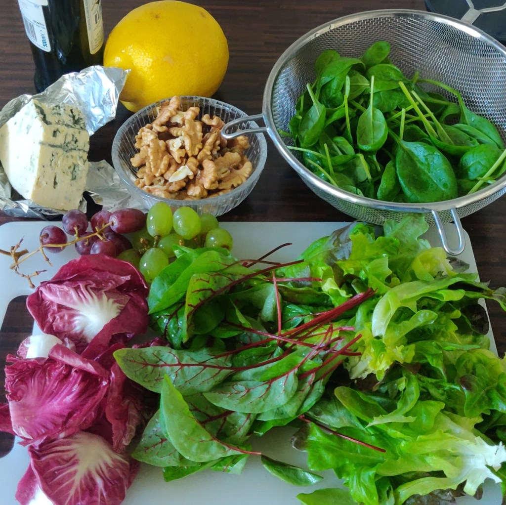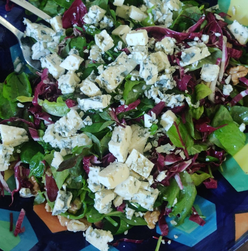 This salad is really simple to make, but packs a lot of flavor. Using salads with a strong flavor is recommended. I used radicchio and sorrel to give flavor, but other bitter salads would also work, like arugula. I prefer using a crumbly blue cheese instead of a creamy blue cheese, mostly because it’s just easier to cut and mix. This salad makes for a nice, light lunch by its self or make some toasted garlic bread and a glass of white wine for a lovely dinner.