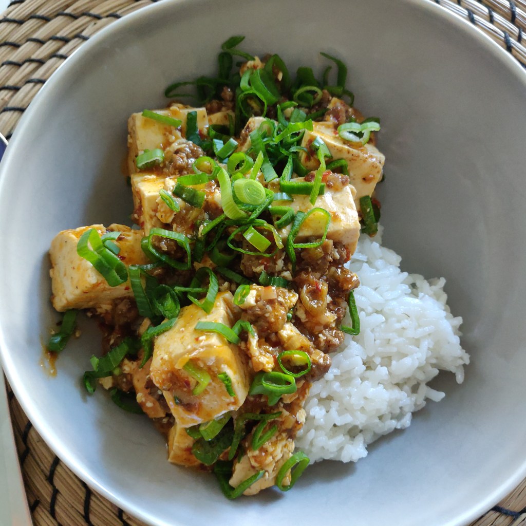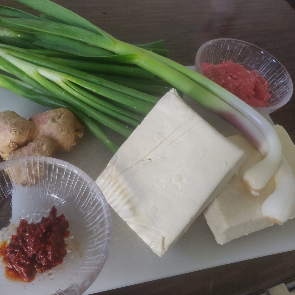 Mapo tofu is one of my favorite foods. This recipe calls for minced meat, but if you want to make a vegetarian version of it you can substitute it with shiitake mushrooms and get a similar result. In the summertime I can get garlic greens, which really rounds out the flavor. The heart of this dish is the doubanjiang, a spicy fermented bean sauce. This is crucial for mapo tofu, and I haven’t found anything that could replace it. It should be found in well-stocked Asian grocery stores.