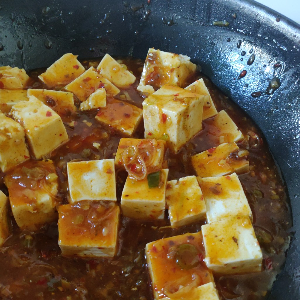 - Once your sauce has thickened up, add the tofu cubes. Coat them with the sauce and leave to simmer for 5-10 minutes. If the sauce seems too dry, add more water.