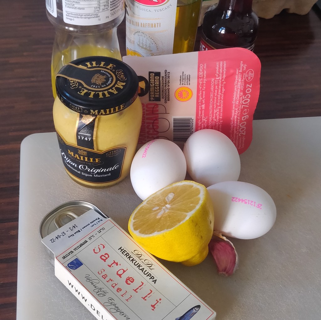 - Cut anchovies and garlic into thin slices. Combine with egg yolks, mustard and lemon juice. Whisk together while slowly adding in the oil in a steady stream. Once the dressing has come together, you can add in a couple drops of Worcestershire sauce or some grated parmesan cheese to adjust the flavor of the dressing.