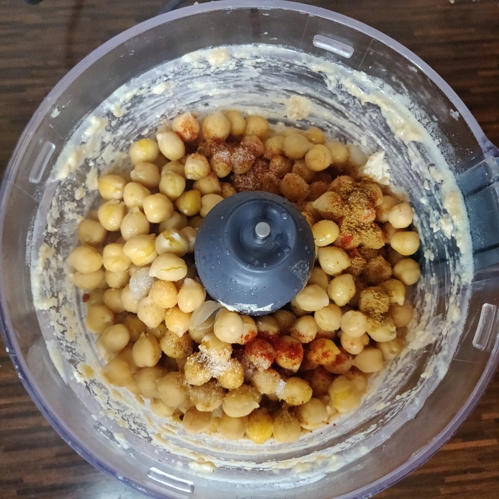 Drain the boiled chickpeas and add them into the food-processor along with the salt, cumin and paprika. Process until the mixture has a chunky texture, and then start adding olive oil in batches, blitzing the mixture in between. Continue doing this until the hummus reaches your desired consistency.
