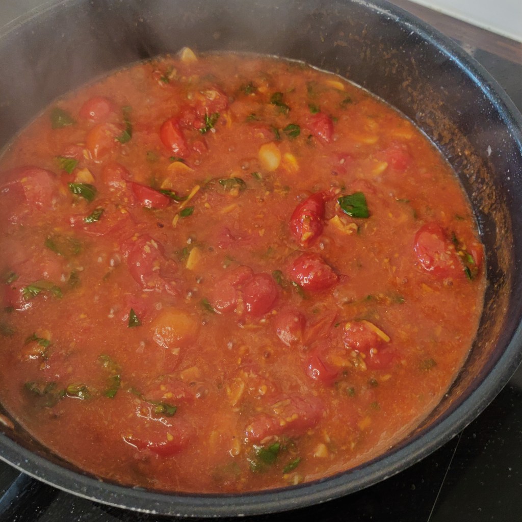 Roughly chop the anchovies and add in to the pan. Stir for ~30 seconds and add in the canned tomatoes. turn the heat down to medium and leave to simmer.